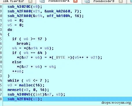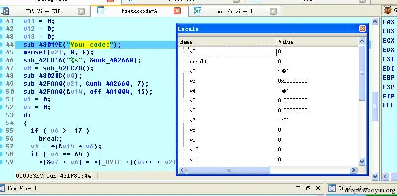 上面的代码具体是干什么的,我们暂时不去关心,这时按F9让程序继续执行,然后输入认证码,随便输入一串字符就好,输长一点,回车之后到达了我们之前下断的wrong code这里,IDA反编译的伪C代码如下: