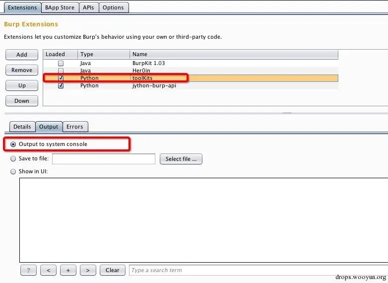 读者可以在此插件的基础上修改为任何你想要执行的命令或程序 并指定不同的参数,如:使用 请求原始数据配合 SQLMap 进行SQLi 测试。另外在使用该插件过程时,可以将输出设置为系统控制台输出,如下图所示: