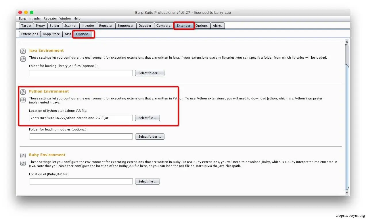Python 编写的插件文件后缀为 py 文件,不能由 Burp 直接加载,所以在加载前需要先设置 Jython 的路径。