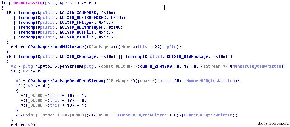 我们知道CVE-2014-4114漏洞的成因在于packager.dll的CPackage::Load方法加载对应的OLE复合文档对象时,对不同类型的复合文档有不同的处理流程,其中对某些复合文档嵌入的不可信来源文件没有经过处理,从而使得攻击者可以通过伪造OLE复合文档的CLSID来达到执行特定文件的效果: