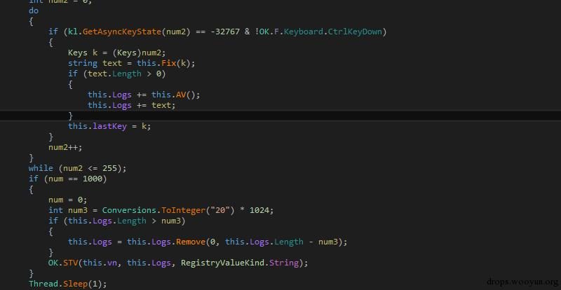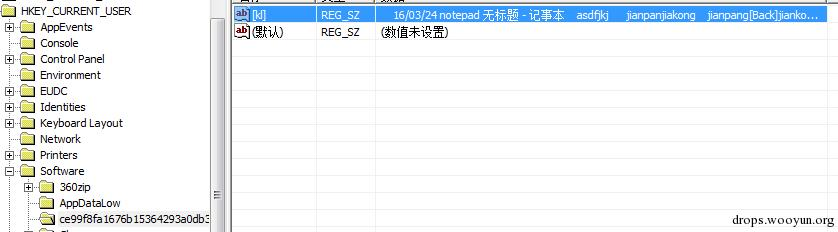 开启键盘记录线程,并将记录信息保存在注册表HKEY_CURRENT_USER\SoftWare\ ce99f8fa1676b15364293a0db3d6a707中: