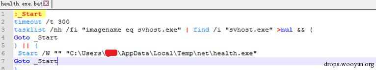 health.exe.bat的代码如下,作用是不断遍历进程查看svhost.exe是否启动,没有启动的话则将其启动。
