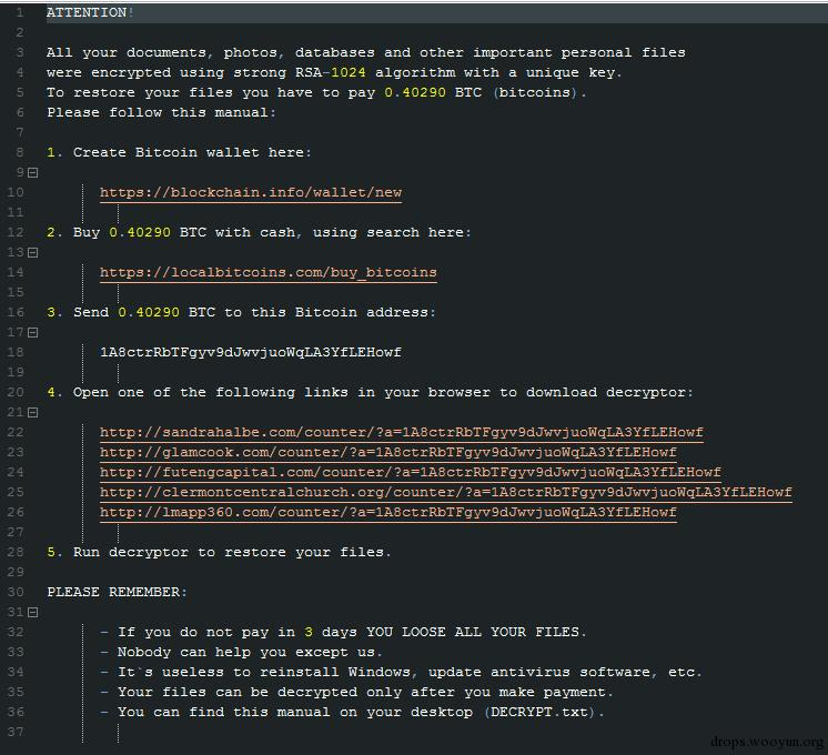 但这都不是重点,重点是木马在加密完文件之后给出的敲诈信息: