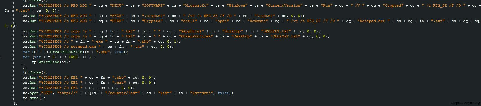 这次出现的敲诈者木马就是典型的例子——一个javascript脚本木马释放出了一个php脚本木马和两个powershell脚本木马。而powershell木马甚至都没有落成ps1脚本而是直接在注册表中存储,php木马有落地的php文件,但php脚本既然能实现对称加密的敲诈者木马,更高一级的不对称加密敲诈者木马真的还会远么?