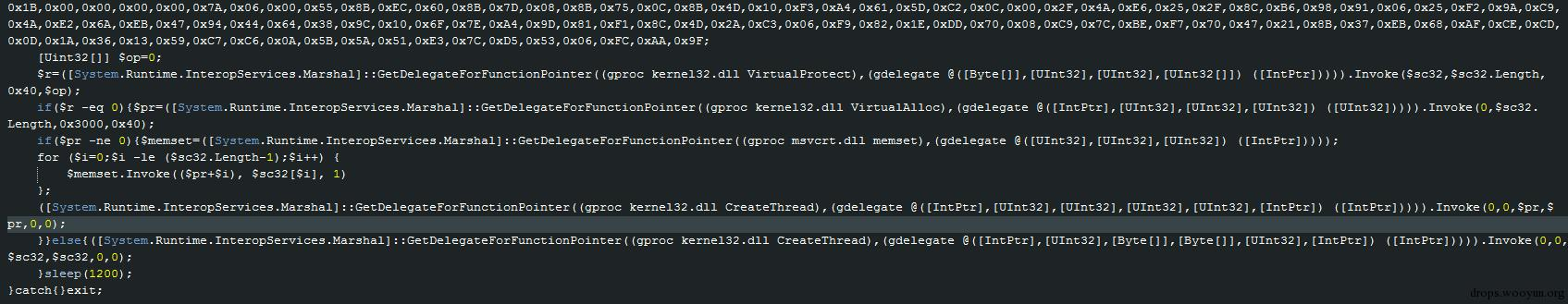 显然,虽然已经解密到最终一步,但中间的变量“$sc32”依然让人看着有些不知所云……但看到ps1代码的最后,发现其实这已经是最终代码了。最终就是将$sc32的内容全部加载带内存中执行: