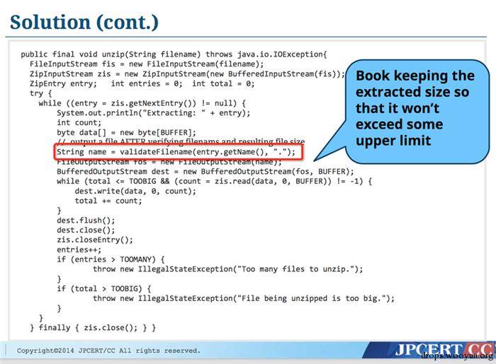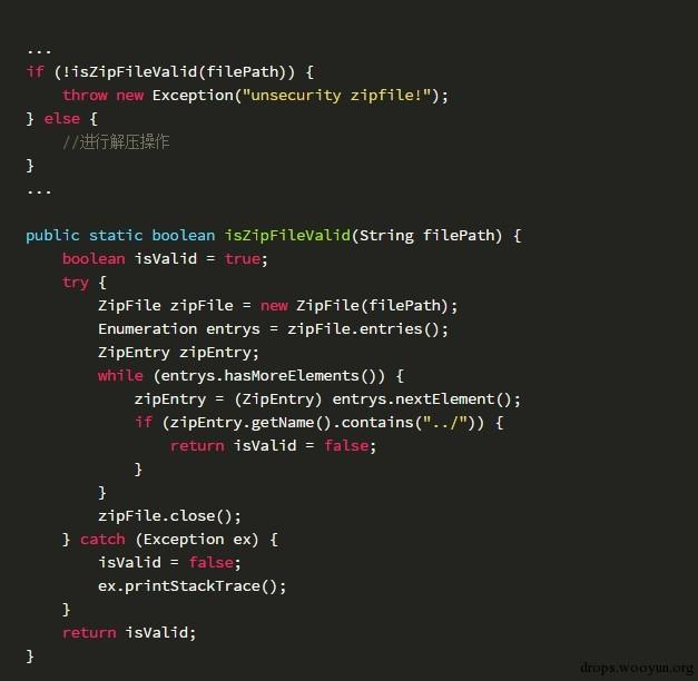 在使用java.util.zip包中ZipInputStream类的进行解压操作时,进行检查,示例如下: