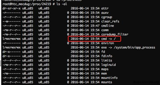 查看进程状态,得到的APP进程的当前工作目录cwd是链接到了根目录:
