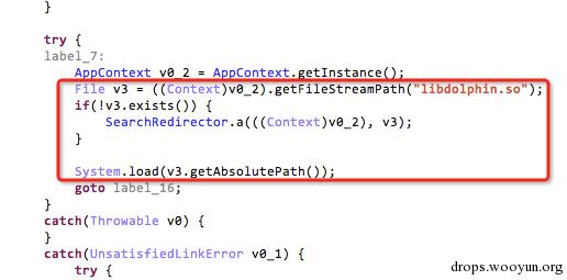 应用使用的是System.load()来加载libdolphin.so而非System.loadLibrary(),在Android中,System.loadLibrary()是从应用的lib目录中加载.so文件,而System.load()是用某个.so文件的绝对路径加载,这个.so文件可以不在应用的lib目录中,可以在SD卡中,或者在应用的files目录中,只要应用有读的权限目录中即可。