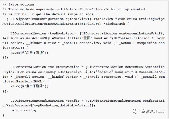 3、iOS 11之后,tableView的delegate增加了两个方法,用来取代editActionsForRowAtIndexPath方法,如下: