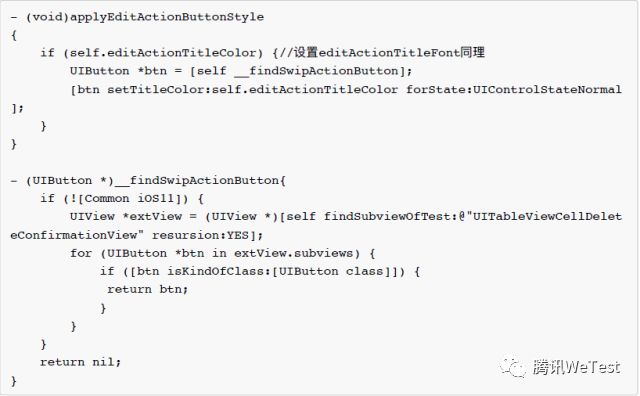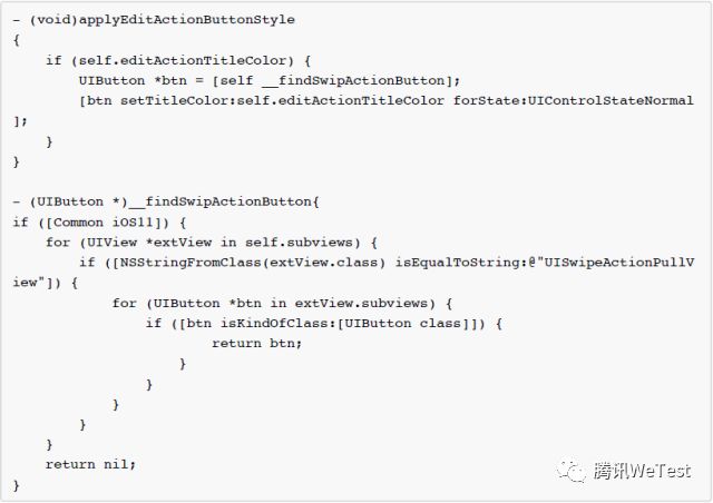 由上图可知,左滑的操作按钮是在UITableView的子view,所以我们可以在UITableView的category中hook掉layoutSubviews方法,找到UISwipeActionPullView的子view button,设置字体颜色和大小。