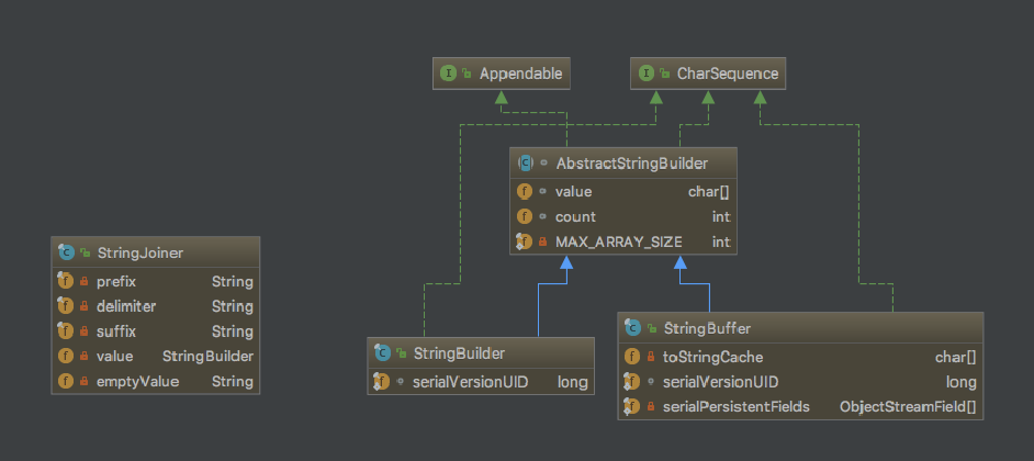 另外StringJoiner是Java8所提供的的一个字符串工具类,从类图来看和其他的类都没关系,其内部只是对StringBuilder的一种封装,便于更加轻松地连接字符串.