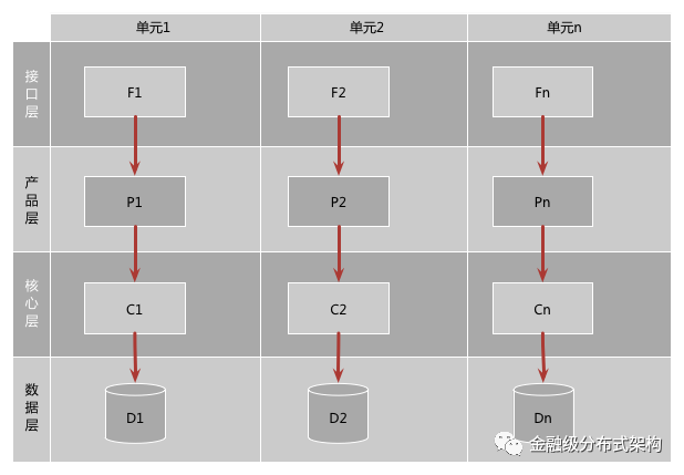 单元化架构下,服务仍然是分层的,不同的是每一层中的任意一个节点都属于且仅属于某一个单元,上层调用下层时,仅会选择本单元内的节点。
