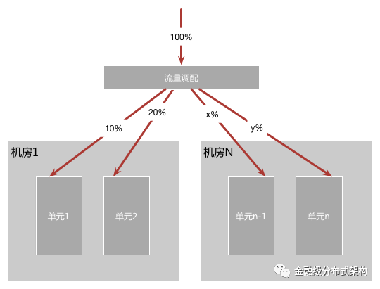 一个单元,是一个五脏俱全的缩小版整站,它是全能的,因为部署了所有应用;但它不是全量的,因为只能操作一部分数据。能够单元化的系统,很容易在多机房中部署,因为可以轻易的把几个单元部署在一个机房,而把另外几个部署在其他机房。借由在业务入口处设置一个流量调配器,可以调整业务流量在单元之间的比例。