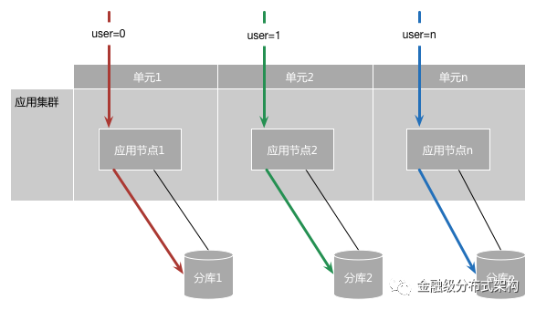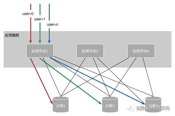 同一个应用的所有节点,都会连接这个业务的所有数据分库,每个分库上部署了若干数据分区。任意一个应用节点都可能接收到来自任意用户的业务请求,然后再根据数据分区规则,访问对应分库的数据。