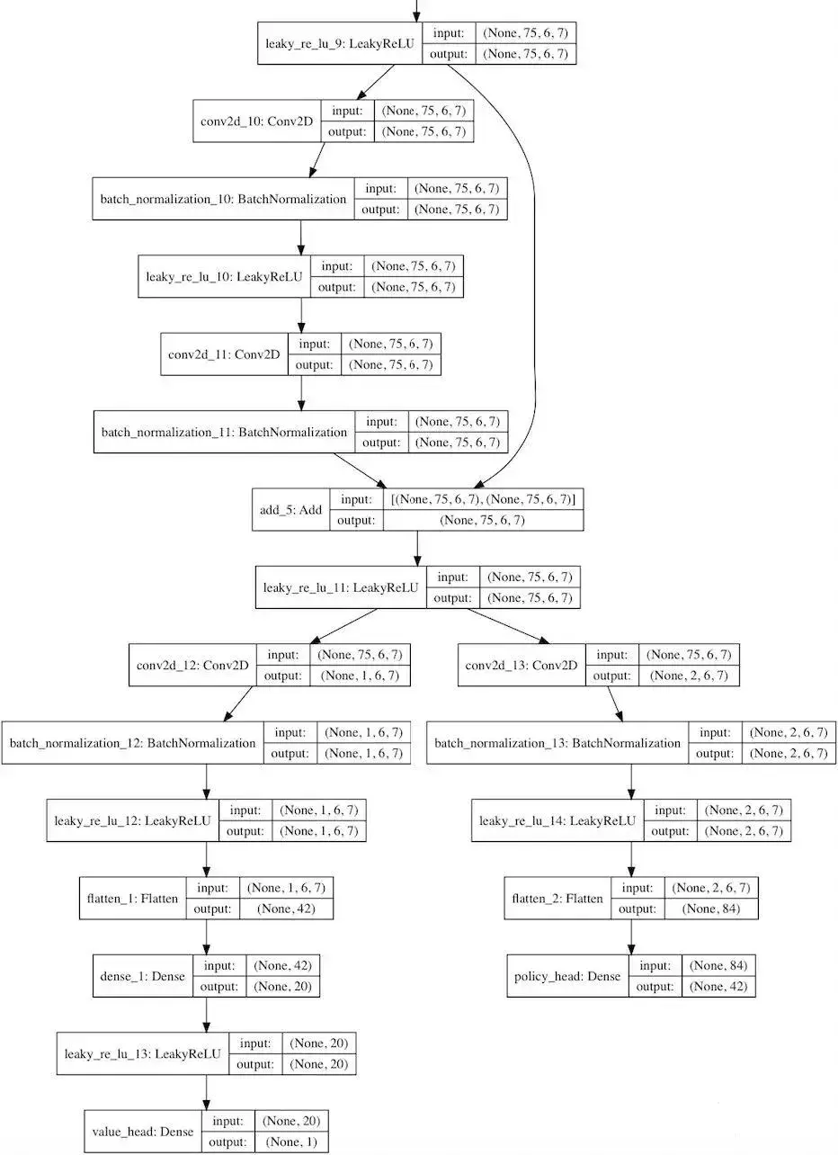 它使用了AlphaGo Zero论文中的神经网络结构的浓缩版本,然后是许多残差层,然后分裂成价值和策略两个分支。