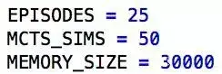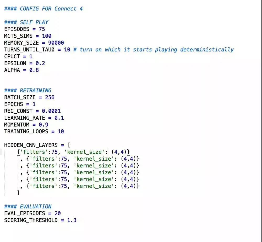 调整这些变量会影响运行时间、神经网络的准确性和算法的整体成功与否。上述参数能生成一个高质量的四子连珠(Connect4)玩家,但需要深长时间。想让算法加速,可以尝试用如下的参数替代: