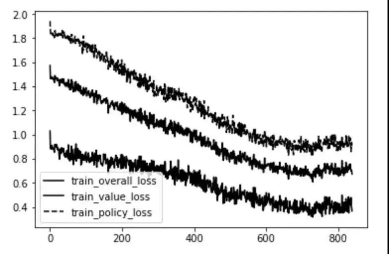 最上面的一行是策略端的误差(MCTS的交叉熵移动概率与神经网络的输出相对应),底部是与值之间的误差(实际游戏值与神经网络值之间的均方差),中间这根线是上述两者的平均值。