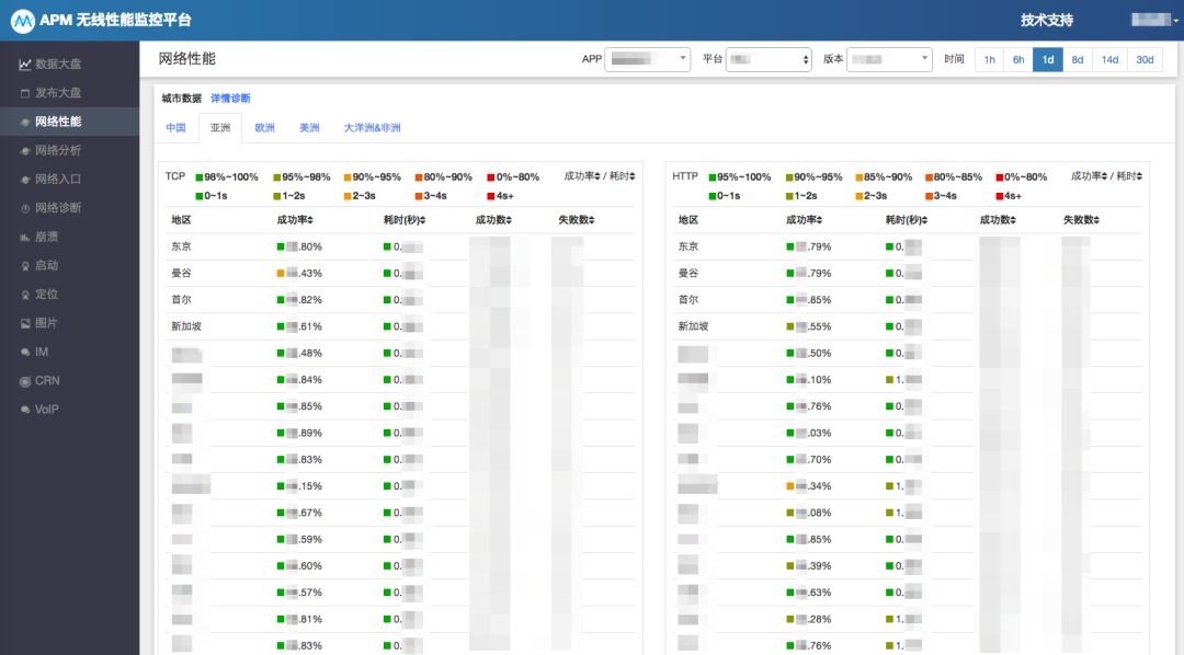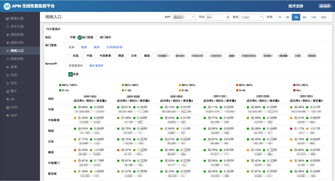 对端到端网络服务成功率,平均耗时和访问量进行监控(图7),并且提供全球热门国家和热门城市细分维度。