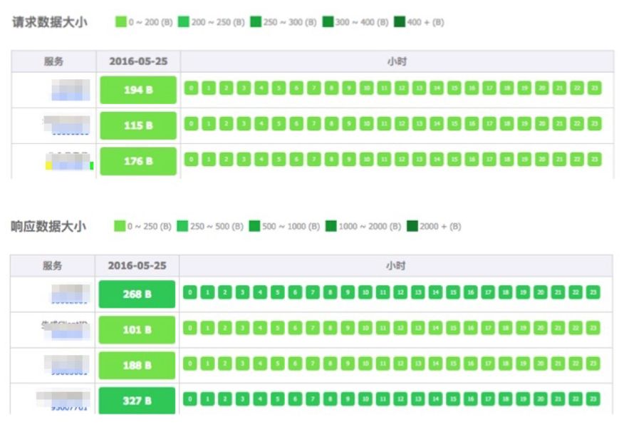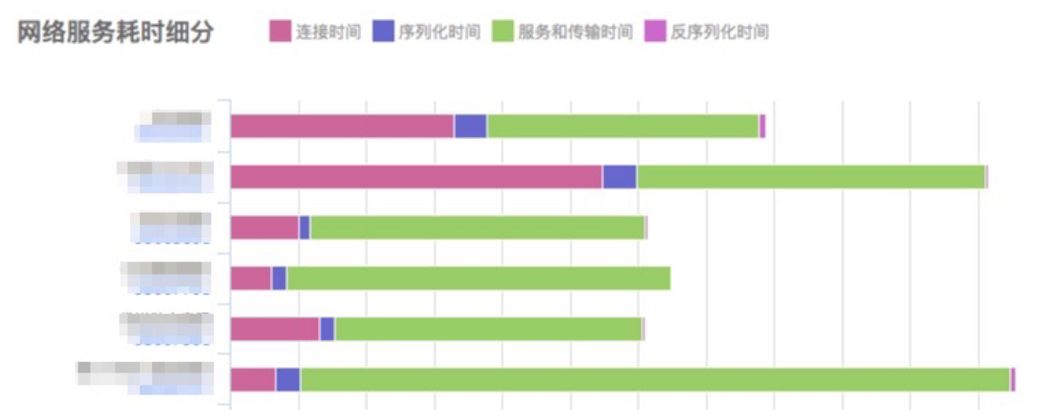 其他的监控数据还包括网络服务请求和响应数据大小、服务错误类型分布以及服务耗时细分(图3-5),也是为具体服务的性能优化提供数据依据: