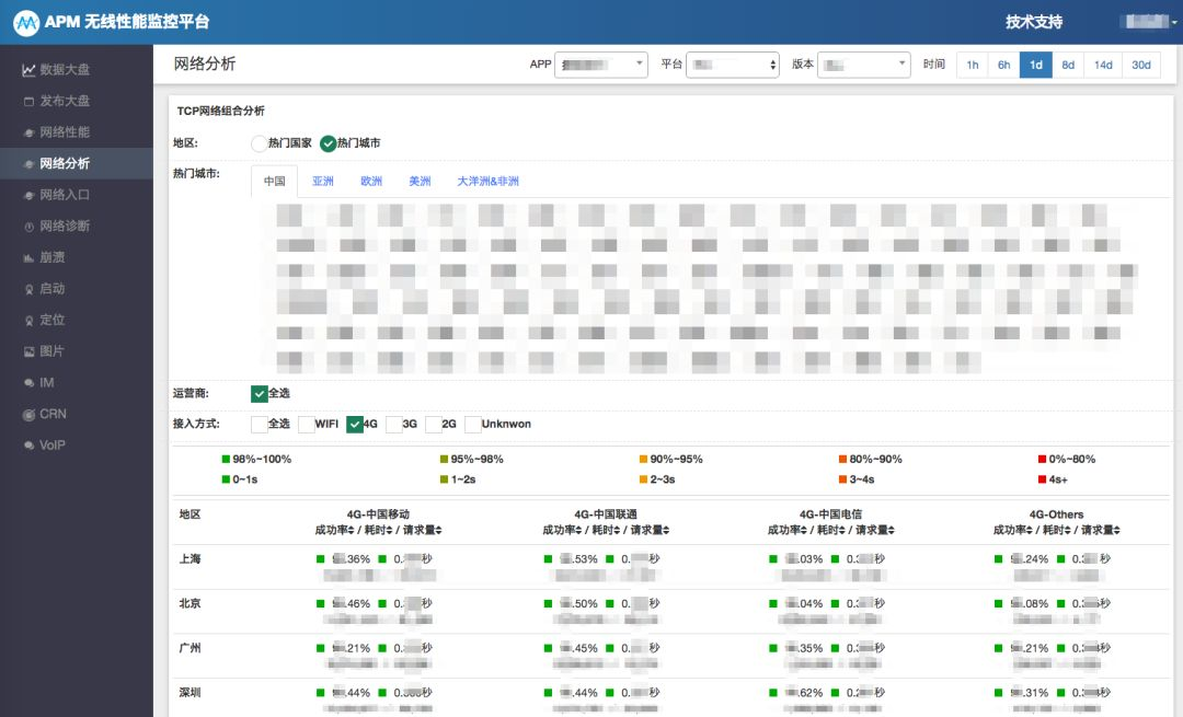 提供不同维度下的网络性能组合分析,可以从国家、城市、运营商、接入方式这几个方面实现组合监控,方便发现多种组合条件下的问题(图8)。