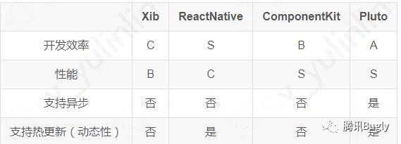 Pluto 相比 React Native 来说,组件不够丰富,使用 JSON 可以让开发效率在描述排版方面接近 React Native;性能相比其他组件来说很不错;支持异步保证了主线程的流畅度;动态性跟 React Native 一样,不能新增控件,控件都是本地预埋。比较依赖本地代码的逻辑,不能修改本地代码的已有逻辑,但是可以替换一部分。当然,逻辑只能预埋的话,也不会有审核风险。