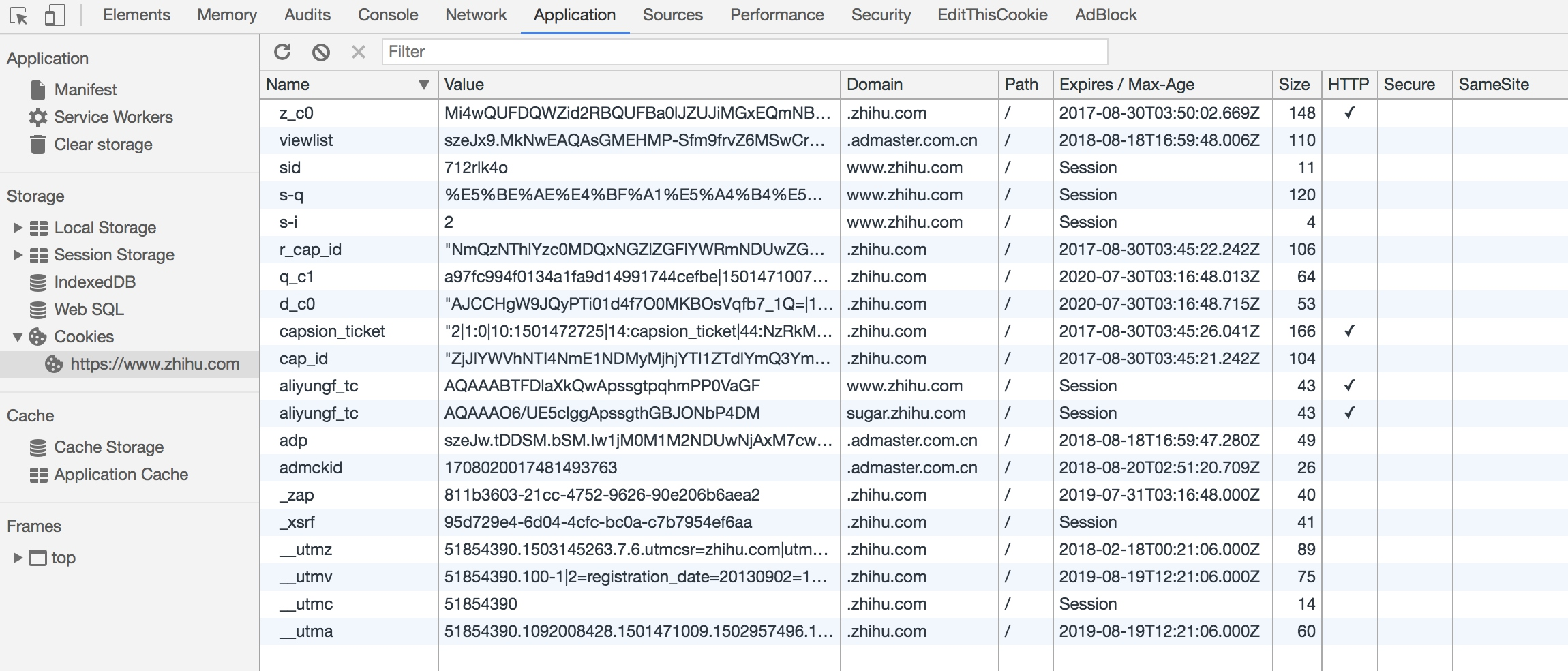 接下来,我们来看看Cookies都有哪些内容。这里以知乎为例,在浏览器开发者工具中打开Application选项卡,然后在左侧会有一个Storage部分,最后一项即为Cookies,将其点开,如图2-13所示,这些就是Cookies。