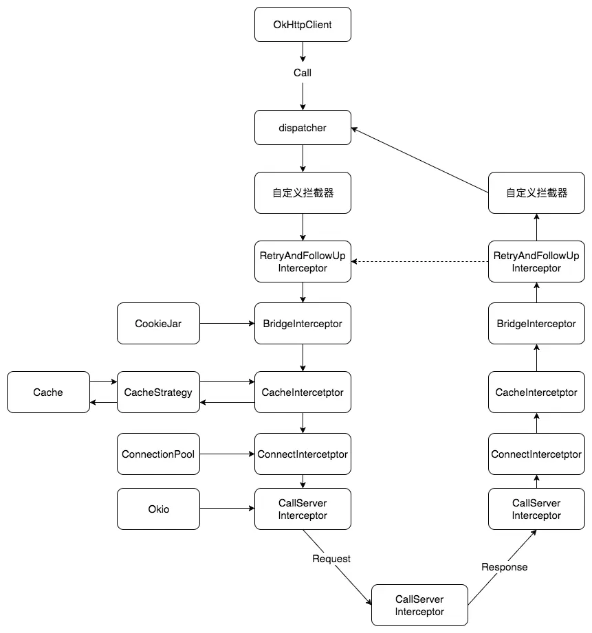 前一篇博客中我们介绍了OkHttp的总体架构,接下来我们以一个具体的网络请求来讲述OkHttp进行网络访问的具体过程。由于该部分与OkHttp的拦截器概念紧密联系在一起,所以将这两部分放在一起进行讲解。