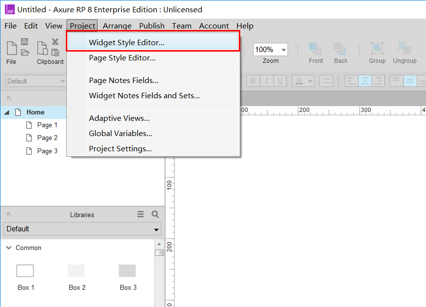 在应用界面左上方点击“project”(项目),在下拉菜单中选择“widget style editor”(元件样式编辑器),即可弹出样式编辑器。
