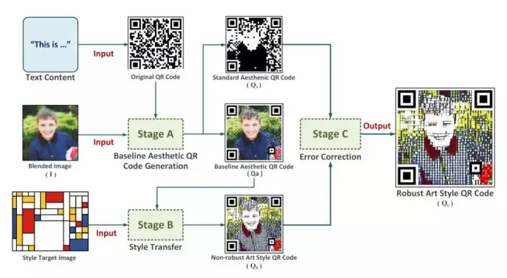 图 6:方法概览。共包括三步:Stage A:生成艺术二维码; Stage B:风格迁移;Stage C:误差修正。