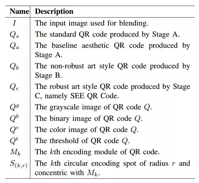 如图 6 所示,我们的方法共分为三步:Stage A、Stage B 和 Stage C。在 Stage A 中,我们生成一个优化过的艺术二维码 Q_a。在 Stage B 中,我们使用一个调整过的神经风格迁移网络对 Q_a 进行风格化,并输出非鲁棒的艺术风格二维码 Q_b。最后,在 Stage C 中,我们通过误差修正机制修复 Q_b 的可读性,获得鲁棒的结果 Q_c。以下将分别介绍这三个基本步骤。