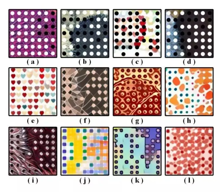 图 4:(a)-(d) 传统方法结果之中的编码模块(参见图 2)。(e)-(l) 我们方法结果中的编码模块。可看到 SEE 二维码中的编码模块同样具有吸引人的艺术元素。