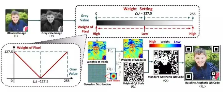 关于融合图像 I^g 的灰度,每个像素的灰度值在 [0, 255] 区间内,黑白模块的灰度值分别是恒定值 0 和 255。因此,我们认为当模块的颜色最接近图像 I 中的对应区域时视觉对比度最小。也就是说,将图像 I 中最黑/最白颜色的区域赋予高权重来对应黑白模块,将大大优化 Q_a 的视觉感知度。基于此,我们将 Stage A 分为计算权重矩阵和融合图像两个步骤。