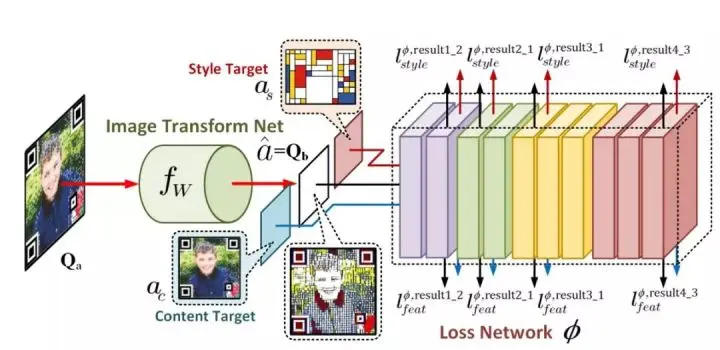 图 8:Stage B 的流程图。我们大致遵循 [16] 所提出的风格迁移系统,并进一步调整了损失网络 φ 的内容重构层和特征,因而不再使用如同噪点那样的黑白方块来增强二维码的风格与美学特征。
