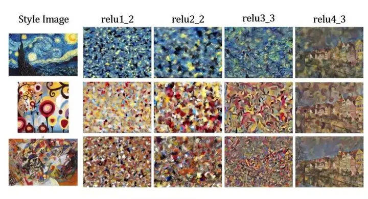 图 9:与 L. A. Gatys[14] 和 J. Johnson[16] 等人提出的框架相似,我们从预训练 VGG-16 损失网络重构了风格特征,以上分别表示 relu1_2、relu2_2、relu3_3 和 relu4_3 层的风格特征重构结果。此外,我们发现低层的重构风格特征与艺术二维码的密集编码模块非常相似。