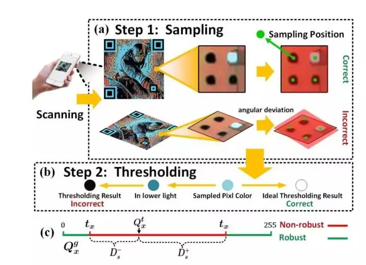 图 10:(a)在采样阶段,收集的像素可能被不直接相关的因素(例如图像缩放、倾斜角度等)影响而导致错误,而本质影响因素是编码模块的尺寸。(b)在阈值化阶段,采样的像素可能被不直接相关的因素(例如,光照、光色等)错误地阈值化,而本质影响因素是编码模块的颜色。