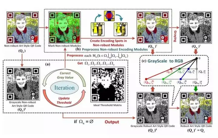 图 11:Stage C 的流程图。(a)迭代地检测、校正非鲁棒的模块,并更新阈值,直到每个模块都变得鲁棒为止。(b)通过创建编码点预处理非鲁棒的模块。(c)转换灰度鲁棒艺术风格二维码到 RGB 空间。