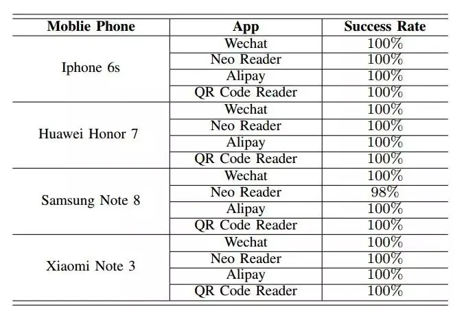 表 4:不同移动设备上的二维码扫描成功率。