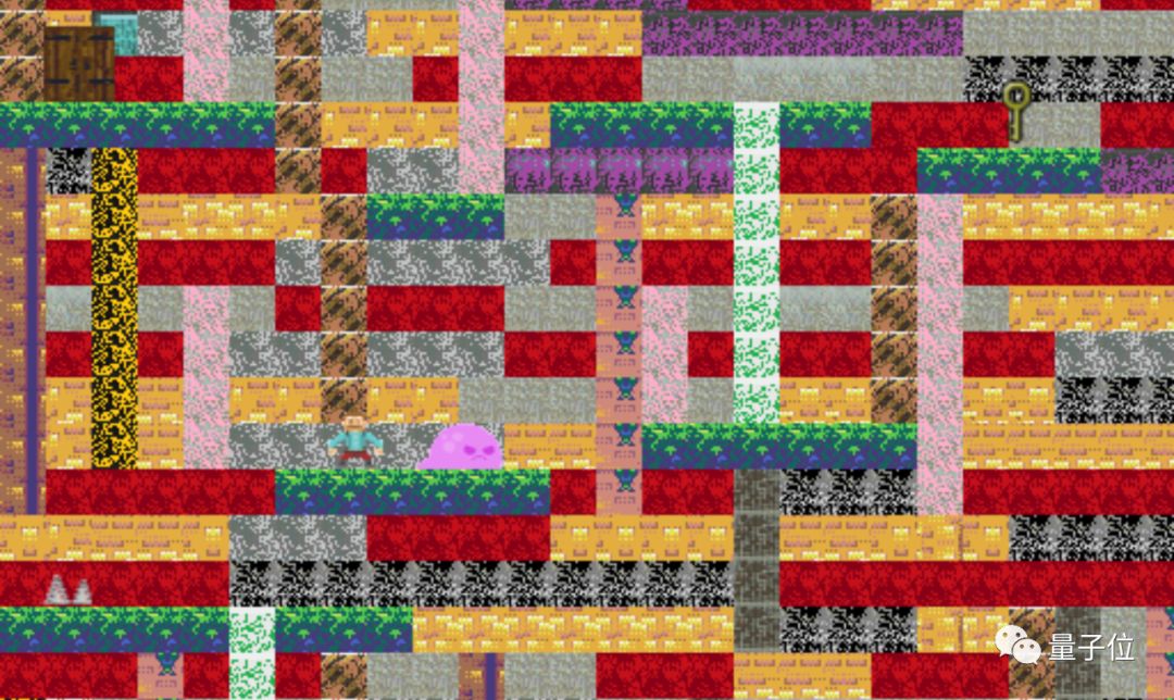即便你不玩游戏,也能看出来,玩家应该躲避粉色的怪物、地刺路障,然后通过跳跃和爬梯子,拿到右上角的钥匙,接着打开左上角的大门。
