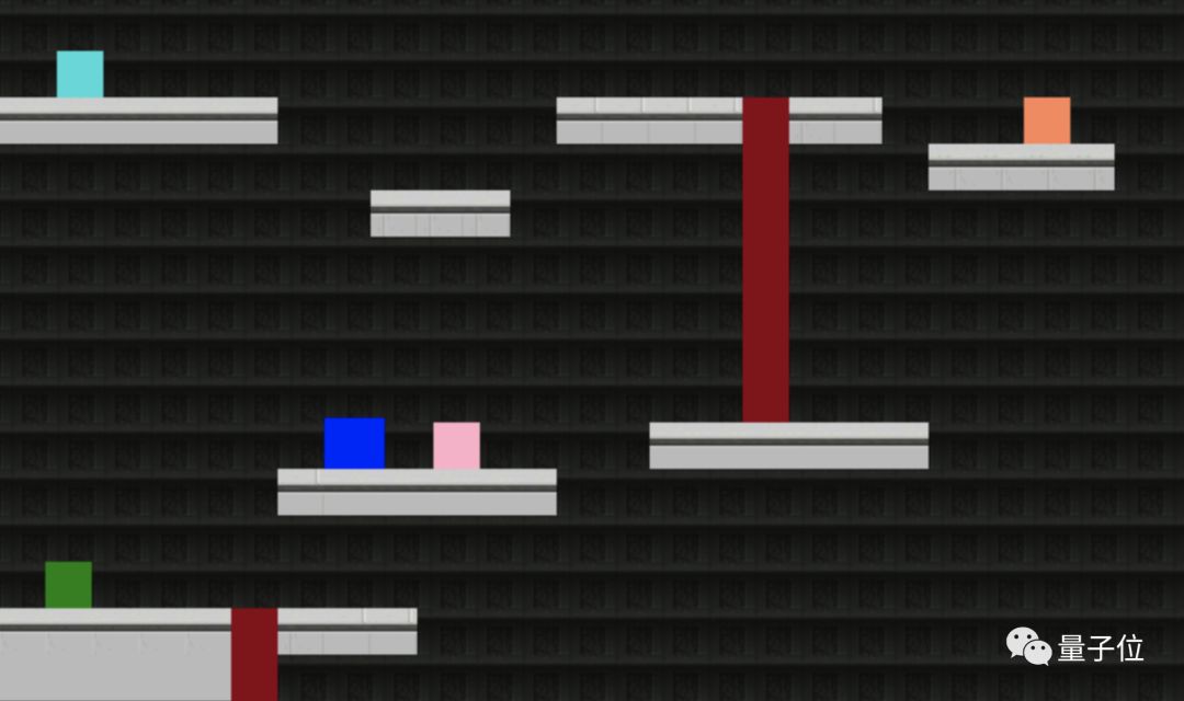 为了测试这一点,小游戏的迷惑性进一步升级。平台上每个空间位置,都使用了不同的色块填充,然而大多数都是毫无作用的色块。代表实际物体的色块,位置和之前相同。当然,如果你是第一次玩这个游戏,这次绝对要懵逼一下了。