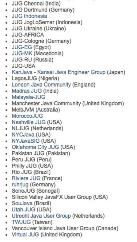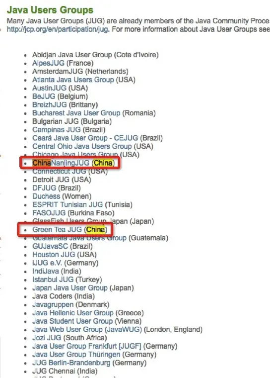 JUG:Java User Groups(Java用户群),以下是JUG官方提供的组织列表,其中有两个是大陆的,一个在南京,一个在杭州,之前在南京时参加过南京JUG组织的活动。