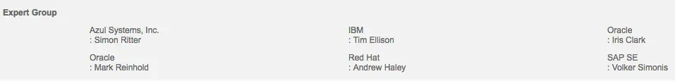 JSR专家组(Expert Group):从JCP里选出的对应领域有威望的个人(其实背后代表的是所属公司),负责制定和修改JSR。其中Java9对应的JSR379的专家组如下: