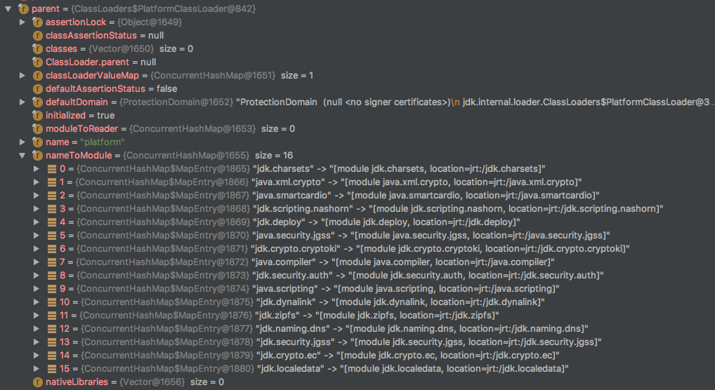 平台类加载器,用于加载一些平台相关的模块,双亲是BootClassLoader。运行时内存模型如下截图: