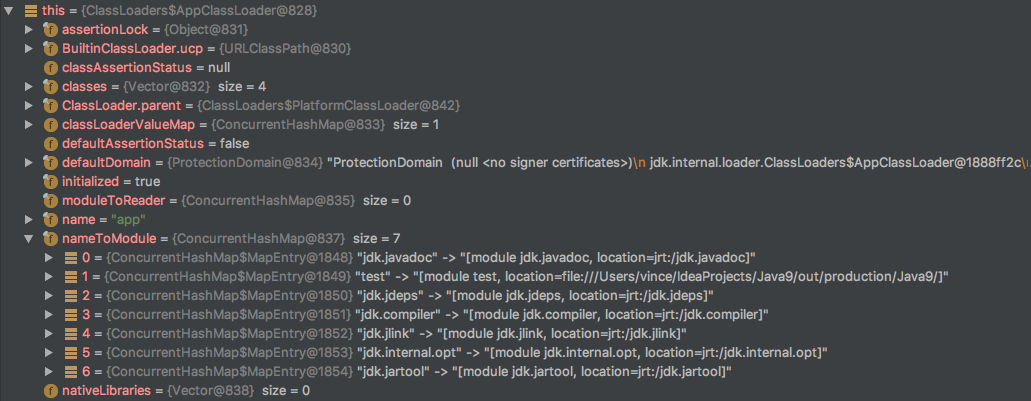应用模块加载器,用于加载应用级别的模块,双亲是PlatformClassLoader。运行时内存模型如下截图: