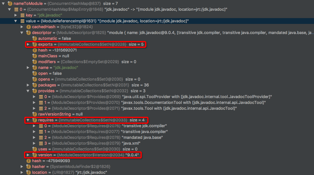 每个ClassLoader都有一个nameToModule,是用于记录当前ClassLoader加载的模块,一个模块里的类只会由一个ClassLoader来加载。nameToModule是一个MAP,name是模块名,和packageToModule不同。nameToModule的运行时模型如图: