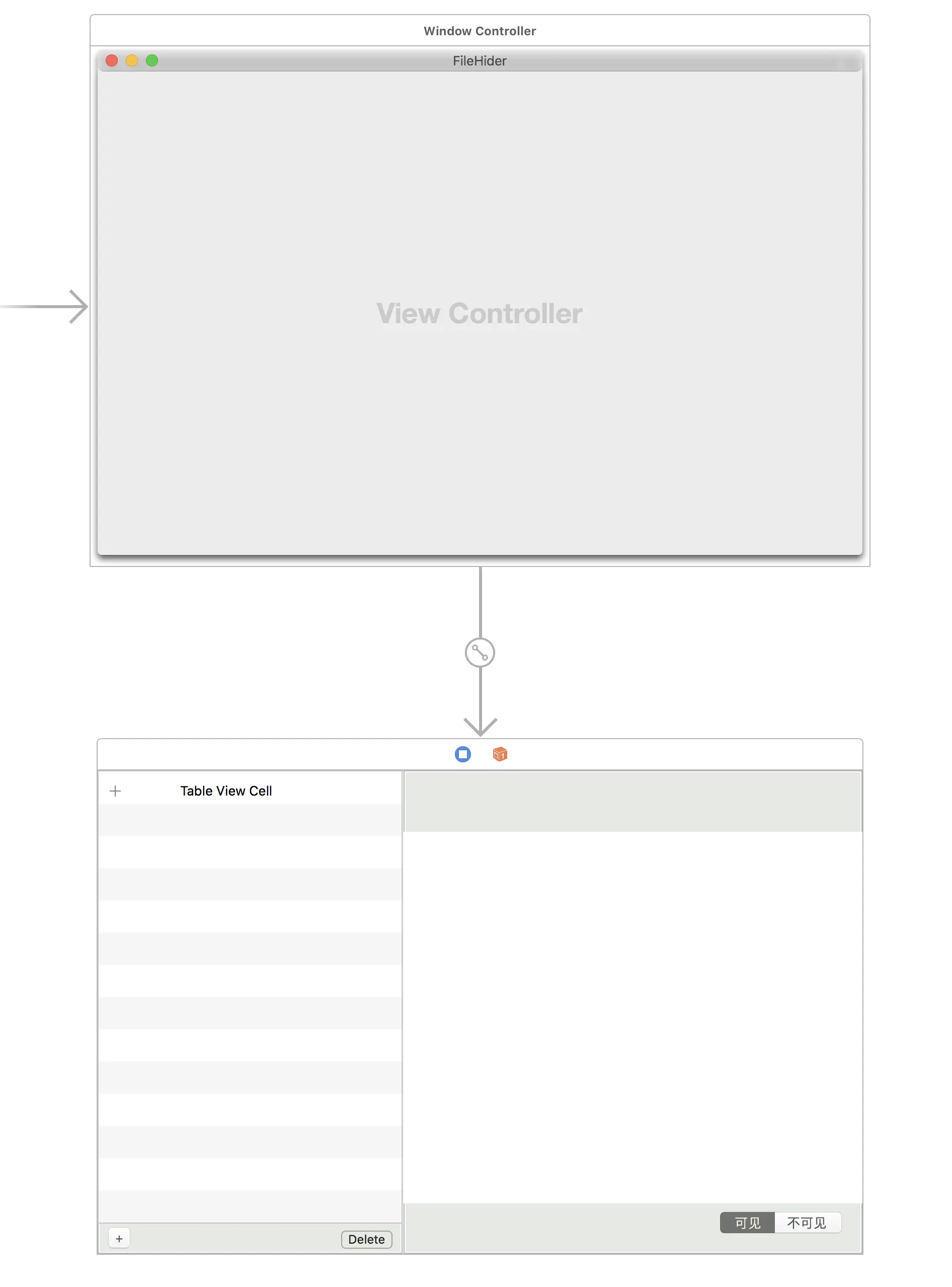 左右分为垂直的两栏,使用了NSSplitView,并调整左右两栏的大小比例,左边显示文件列表和对列表的增加/删除按钮;右边是文件的详细信息与文件隐藏/可见之间切换的NSSegmentedControl。对各个组件定好布局,确保在窗口resize后依然保持着相对较好的样式。