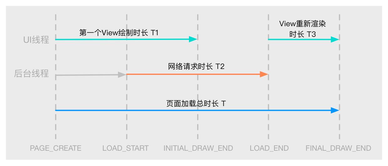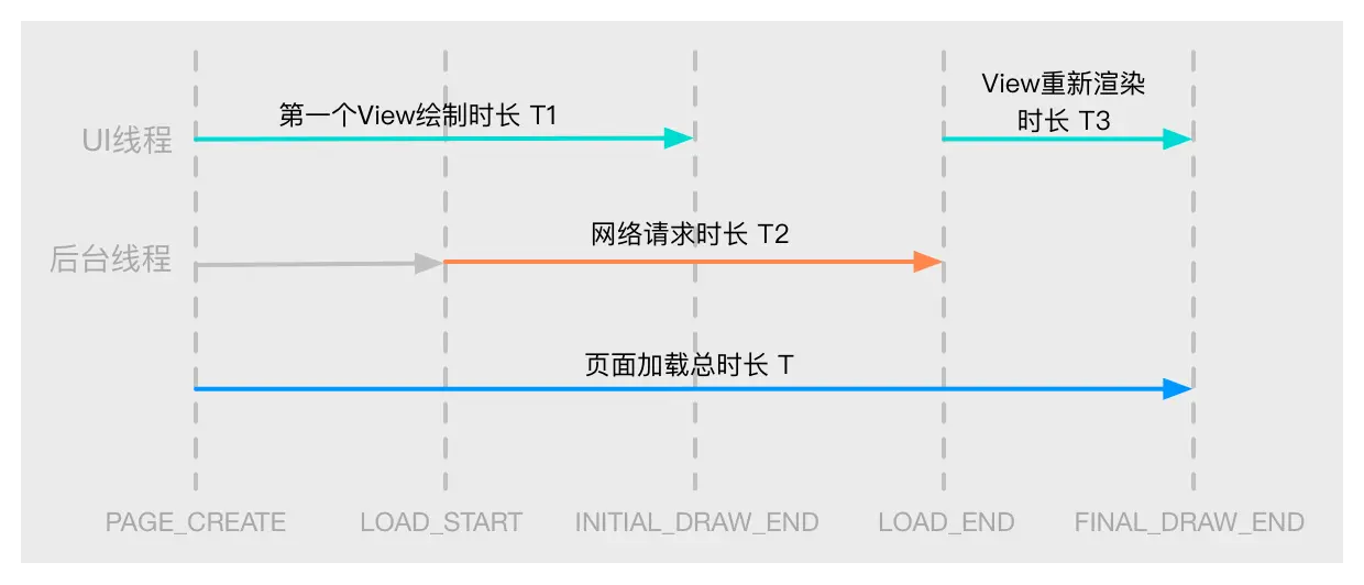 其中T1指页面初始化到第一个UI元素显示的时间,这个UI元素一般是指数据加载时的等待动画之类的。T2是指网络请求时间,这个时间的开始点有可能早于T1的结束点。T3是加载到数据后,为UI填充数据并重新渲染完成的时间。T是整个页面从初始化到最终UI绘制完成的时间。
