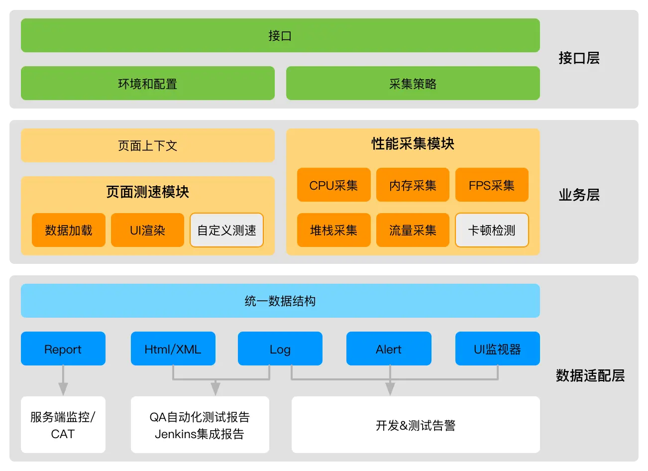 设计上我们第二个考量是SDK的可扩展性。以数据适配层为例,目前内置了五种适配通道,可以将采集到的监控数据适配到不同的数据通道。根据选择的工作模式不同,数据将被适配到服务端监控通道,生成测试报告,或者只在App本地输出日志和提示。这种设计带来的一个好处是,如果需要新增一种数据输出通道,既可以在上层添加一个拦截器,也可以只改动SDK极少量的代码来添加一个适配器。同样的,性能采集模块和页面测速模块的设计也遵循这种思路。