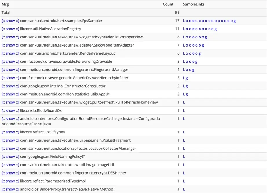 第二个问题是堆栈如何归类,卡顿堆栈的归类和Crash堆栈不同,以最内层代码归类显然是不合适的,因为外层不同的业务逻辑代码在最内层的调用堆栈有可能是相同的。以最外层代码归类也是不合适的,因为最外层代码有可能是业务逻辑代码,也有可能是系统调用。