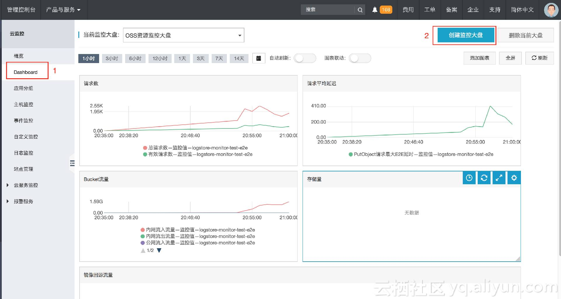 如果想自定义配置一些OSS资源监控图,可以通过云监控的[Dashboard]功能实现。点击左边栏[Dashboard],然后右上角[创建监控大盘],如下图:
